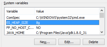 One of the most common Elastic Search Environment Variables is ES_HEAP_SIZE, shown in the System variable panel below.